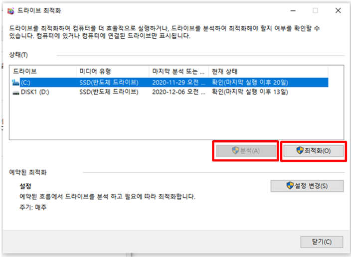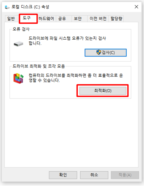 드라이브 최적화 및 조각모음 실행할 수 있는 “최적화”를 클릭합니다.