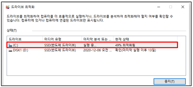 최적화 “실행중…” 나오면서 진행되고 디스크 조각의 상태에 따라서 시간이 오래 걸릴 수도 있으니