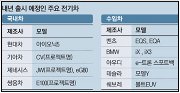 내년 출시 예정인 국내 전기차와 해외 수입전기차 모델들입니다. 참고하세요.