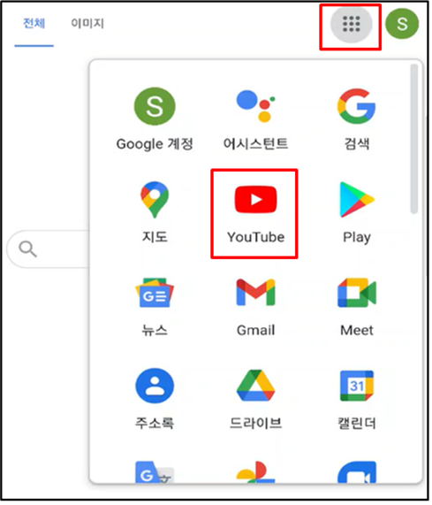 홈 화면에서 “메뉴” 를 선택하고, “YouTube” 아이콘을 클릭합니다.