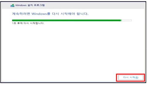 설치가 완료되면 “윈도우 다시 시작” 화면이 나타나는데,