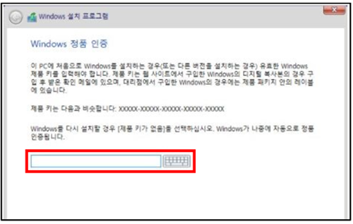 입력 화면에서는 정품 제품키를 입력합니다.
