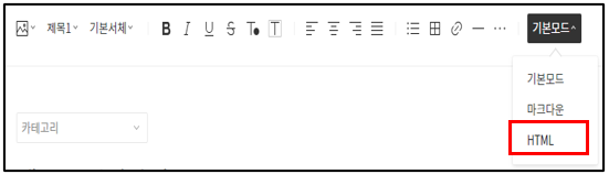 글쓰기 상단 메뉴에서 기본모드를 “HTML”로 변경하여