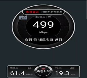 5G 기준으로 측정되었고, 다운로드는 499 Mbps,