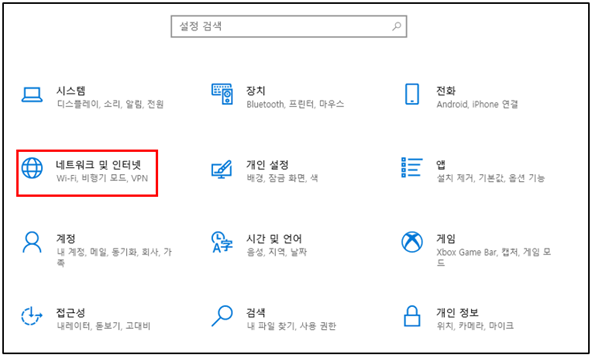 설정 화면에서 “네트워크 및 인터넷” 메뉴를 선택합니다.