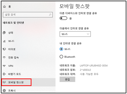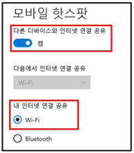 상단의 “다른 디바이스와 인터넷 연결 공유”를