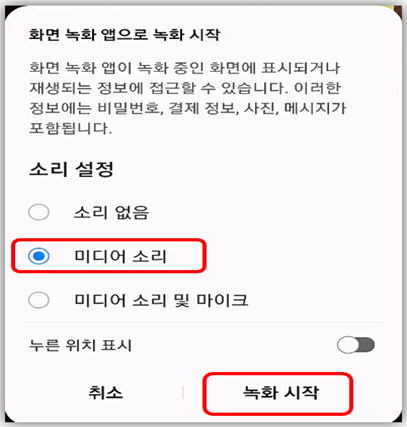 ‘미디어 소리’선택하고 하단 ‘녹화시작’을 선택합니다.