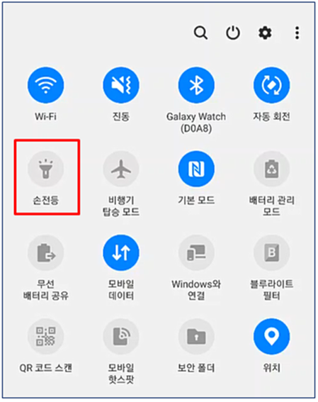그 중에서 “손전등”을 클릭하시면 “활성화” 되면서 카메라 “손전등” 이 켜지게 됩니다.