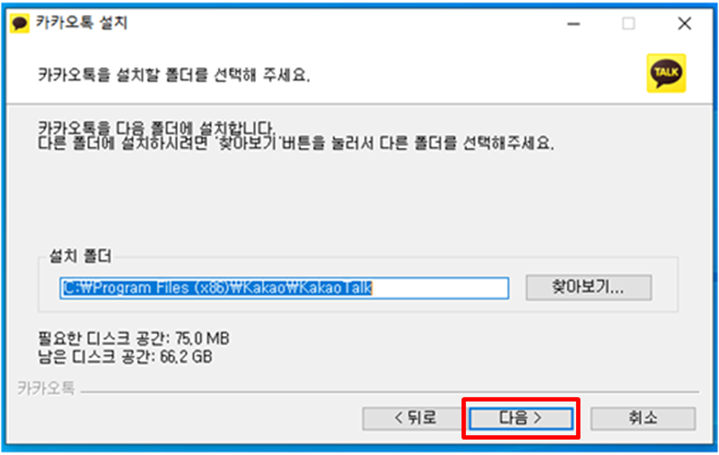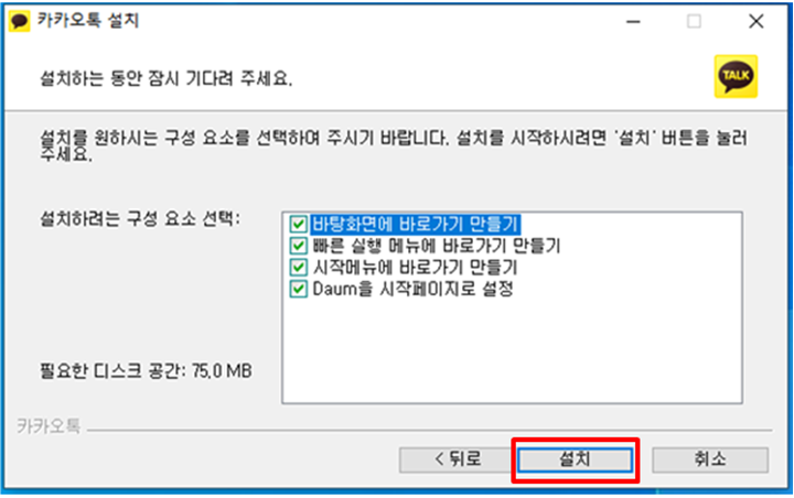 3. 설치 화면에서 “설치폴더” 를 확인하고 “다음” 으로 넘어가서, 설치되는 구성요소를 확인한 다음 “설치” 버튼을 클릭하면 이제 '카카오톡' 프로그램을 PC에 설치를 시작합니다.