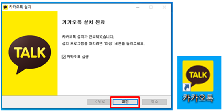 4. 설치가 완료되면 “카카오톡 설치 완료” 화면과 함께 바탕화면에 카카오톡의 아이콘이 생기는 것을 확인 할 수 있습니다.